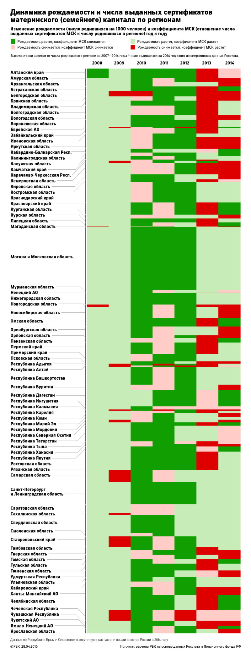 Картина в 2013–2014 годах могла быть еще хуже, если бы не два больших зеленых пятна на тепловой карте — Москва и Санкт-Петербург с областями. Но в этих регионах коэффициент МСК всегда был низок (одна семья — один ребенок), и связывать рождаемость с программой материнского капитала некорректно.