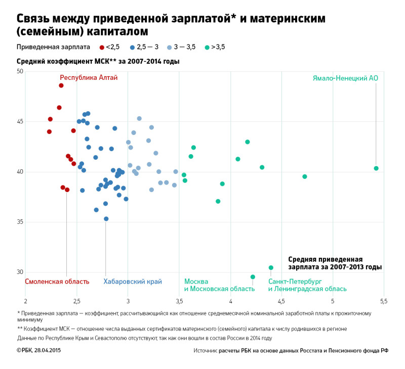 В группе с низкими доходами — коэффициент использования материнского капитала чуть выше, и наоборот. При этом в каждой группе есть диаметрально противоположные случаи. В числе «бедных» регионов — Республика Алтай и Смоленская область, но коэффициент маткапитала существенно отличается из-за демографии. В 2014 году: 21 родившийся на 1000 человек в Республике Алтай, а в Смоленской области — 11.