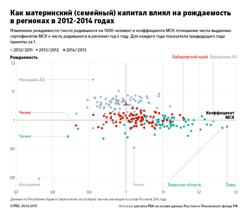 На примере отдельных регионов видно, что ни материнский капитал, ни рост доходов не обеспечивают роста рождаемости в силу демографических причин. Например, у Чечни коэффициент рождаемости и вовсе сильно снизился (на 9% за 2006–2014 годы) — после стабилизации ситуации в республике и увеличения рождаемости последовал провал в поколении родившихся в 1990-х годах.
