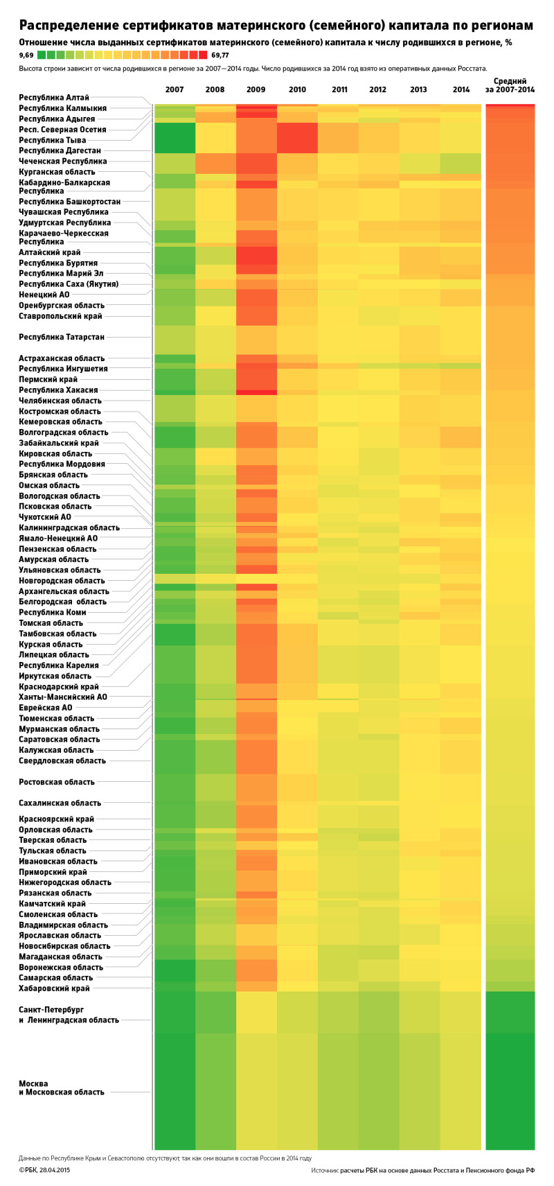 Чтобы представить реальную картину с материнским капиталом, необходимо перейти на уровень регионов, так как показатели рождаемости в отдельных субъектах России отличаются в разы. Для сравнения различных регионов мы ввели расчетный показатель, который назвали коэффициент МСК — это отношение числа выданных сертификатов к числу родившихся за год. На тепловой карте отлично видно, как менялся этот показатель.